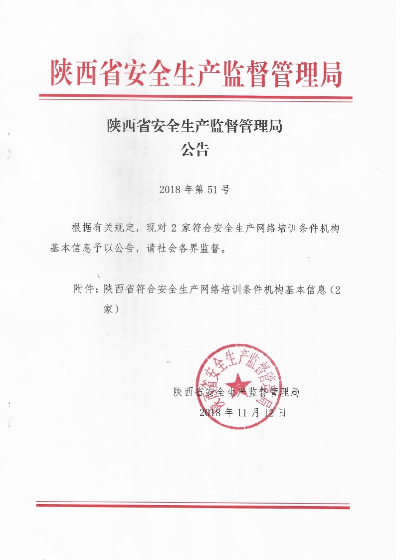 為進(jìn)一步加強(qiáng)注冊安全工程師隊伍管理,提高注冊安全工程師專業(yè)素質(zhì)和執(zhí)業(yè)能力,根據(jù)《注冊安全工程師管理規(guī)定》和陜西省應(yīng)急管理廳注冊安全工程師注冊規(guī)定,陜西鼎祥工程科技有限公司【陜西省安全生產(chǎn)監(jiān)督管理局公告(2018年第51)】決定舉辦注冊安全工程師繼續(xù)教育網(wǎng)絡(luò)培訓(xùn)班。現(xiàn)將有關(guān)事項通知如下: